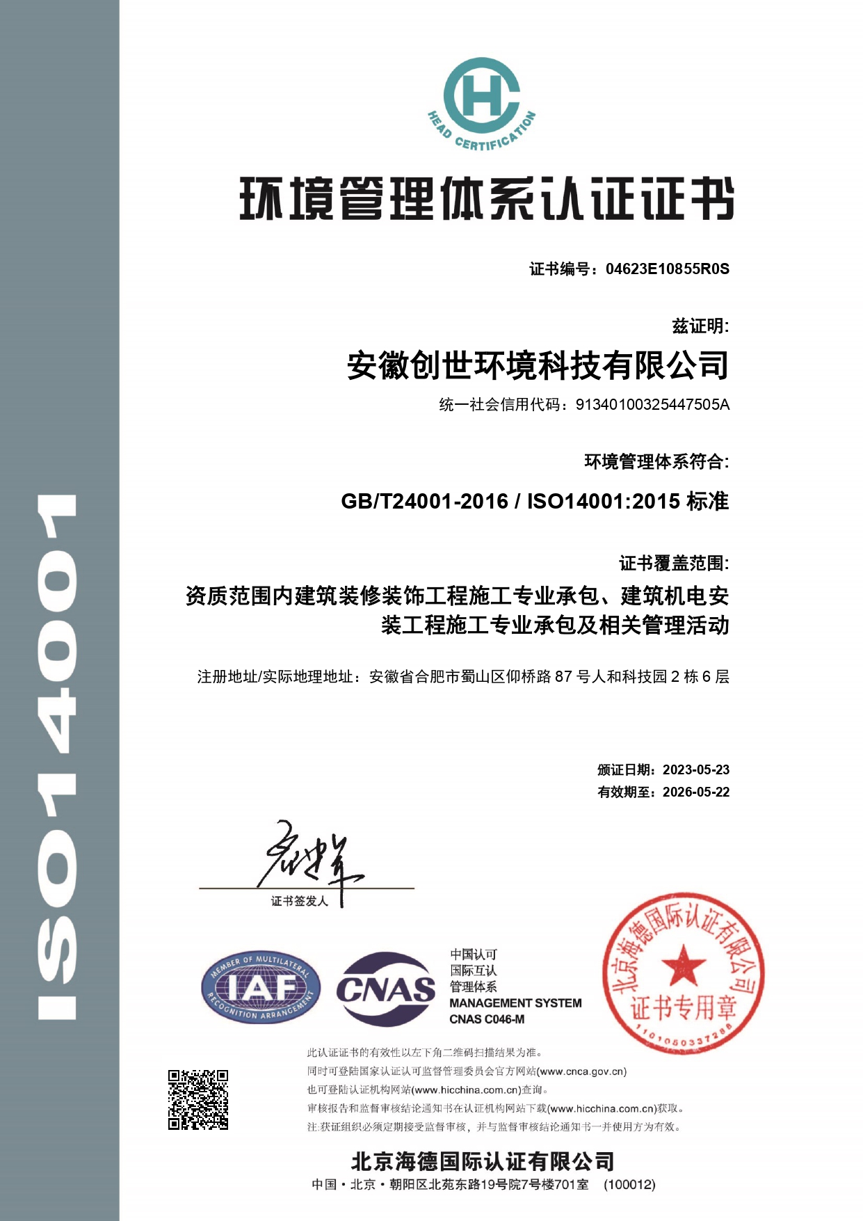 環境管理體系認證證書