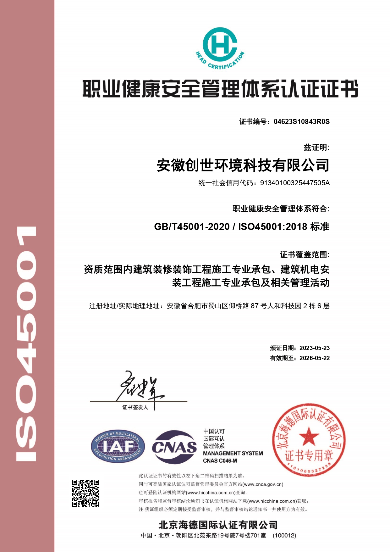 職業健康安全管理體系認證證書